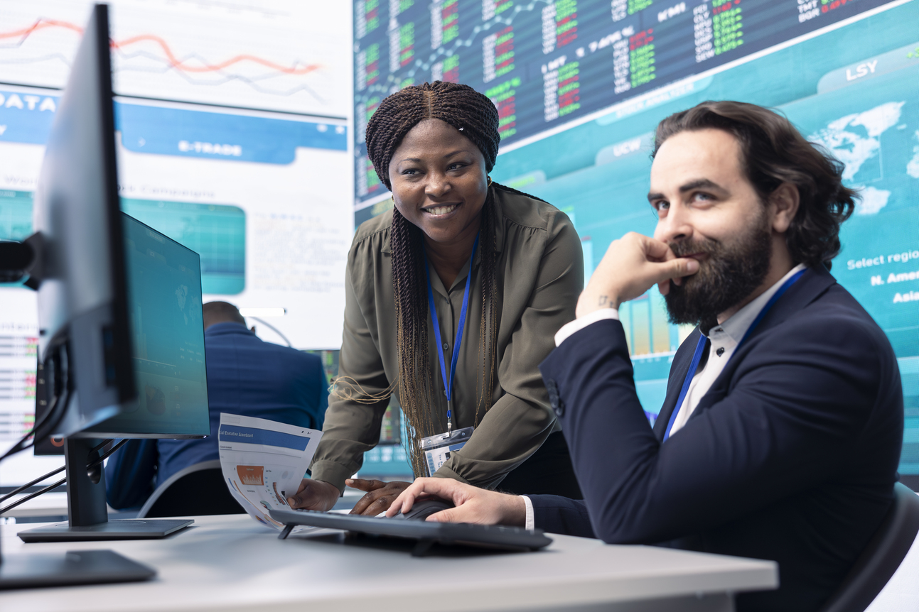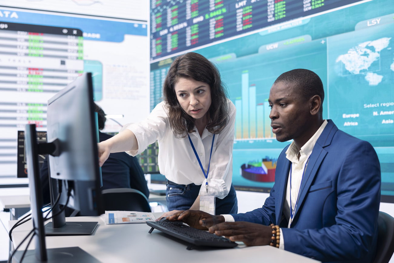 A developer points enthusiastically to the screen, showing his colleague the elegant and efficient code generated by their generative AI coding partner, celebrating a new level of productivity.